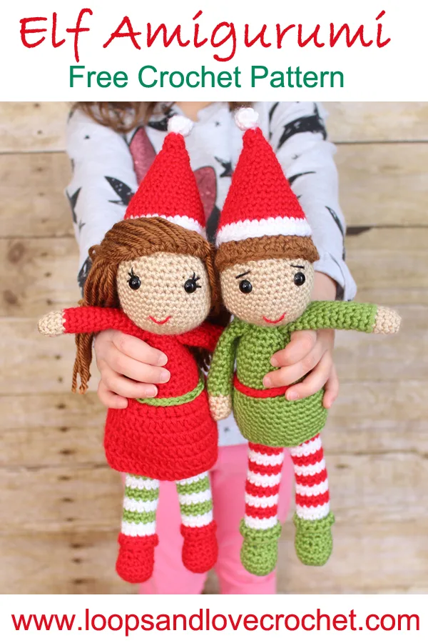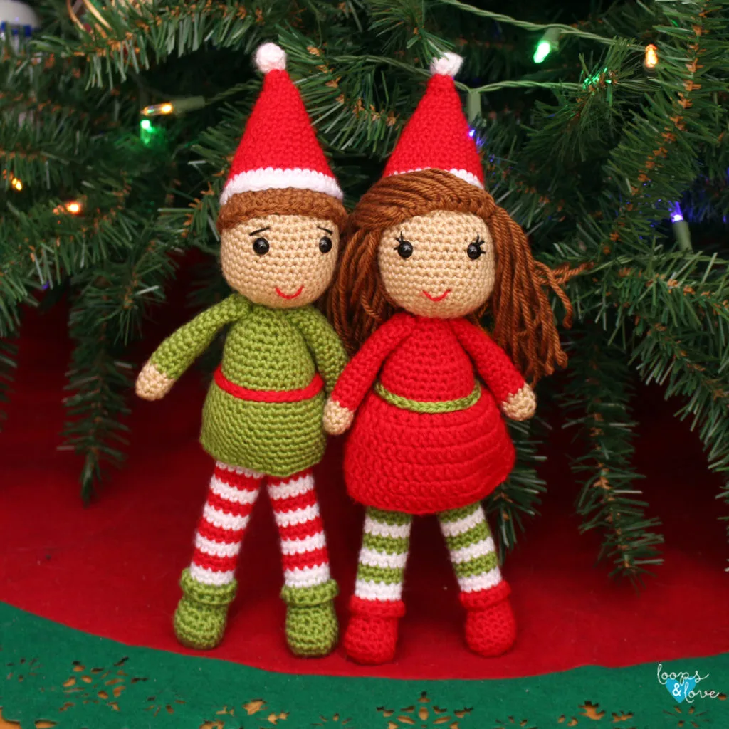Each Elf Amigurumi measures about 12 inches tall when legs are extended, including the hat. The legs are sewn on separately so they can sit independently, but they can also stand if leaned against something. Whether you choose to make one, or the pair, these elves are perfect for cuddling, decorating, or gift-giving this holiday season!