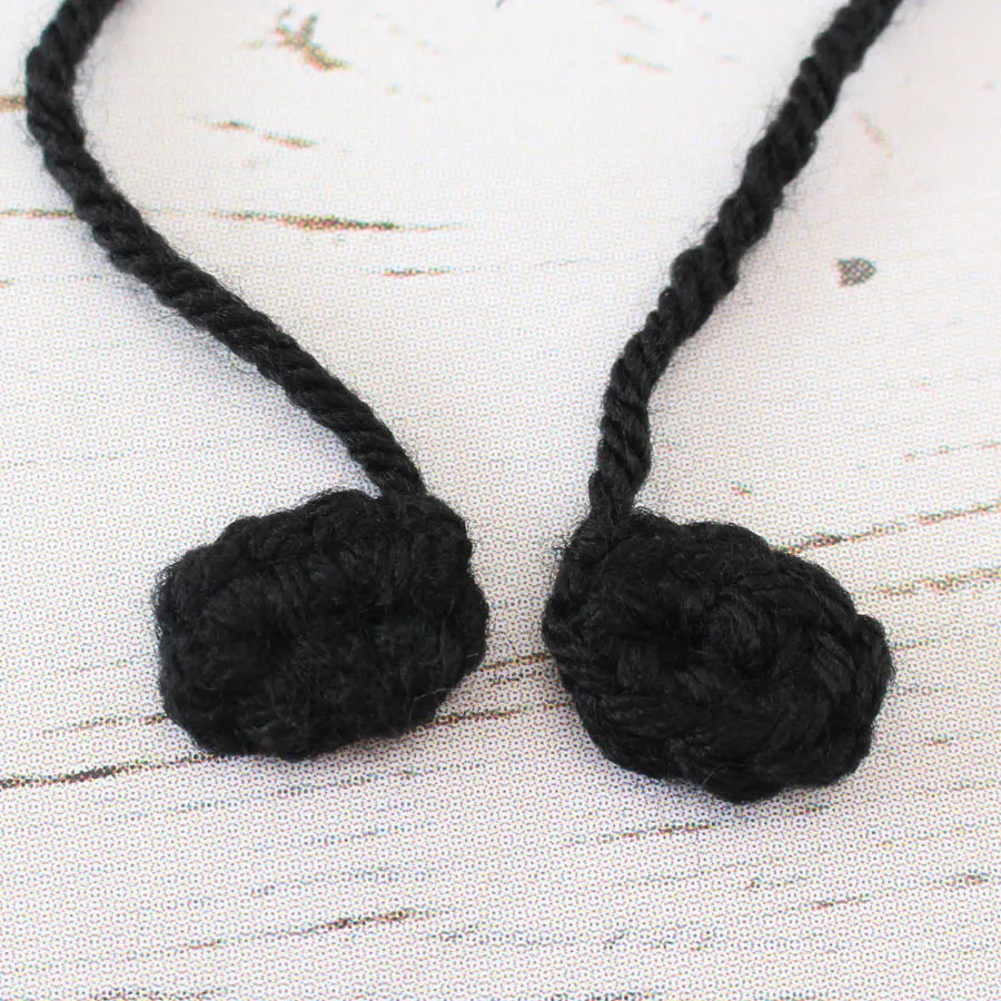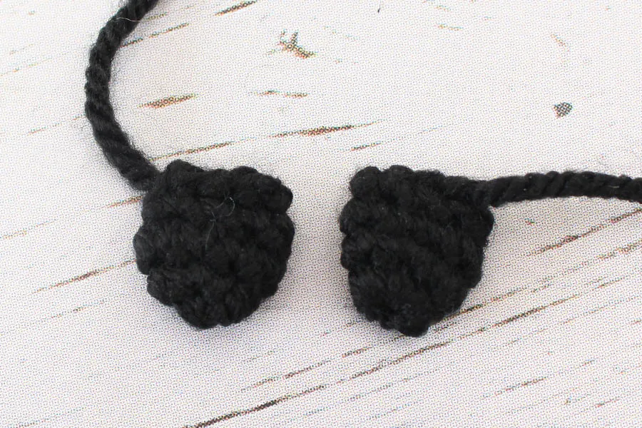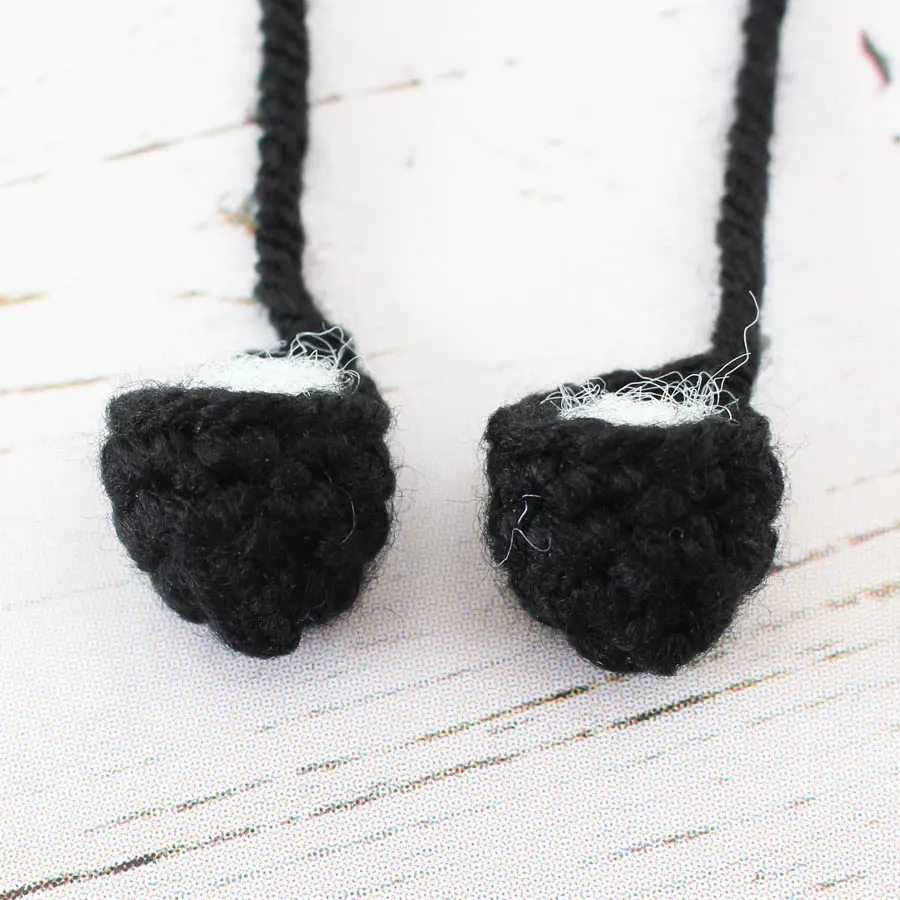 In black yarn, chain 3, make 2 SC in 2nd chain from hook and 4 SC in the last stitch. Now turn your work so you are working on the other side of the chain. Make 2 SC into the last stitch (this is the same stitch as you placed the first 2 SC of the round). Join with a sl st to the top of the first SC of the round.
