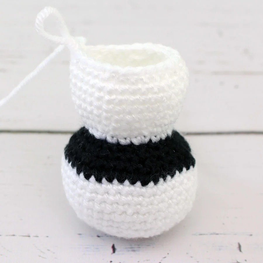 Change to white yarn. Add some stuffing to the panda’s body. Next, increases will be worked again to form the head.