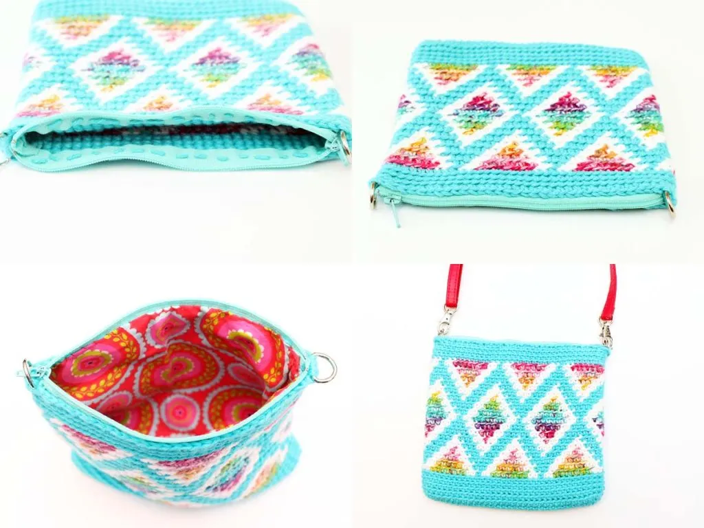 The inspiration for the Diamond Gem Bag came about when my 10 year old daughter picked out some rainbow yarn in my stash and asked if I could crochet her a purse. I wanted to make her something a little more “grown-up” looking with an interesting pattern so I automatically started thinking tapestry crochet. We picked out the turquoise color and white to balance out the two brighter yarns and I went to work on creating a fun graph. She is so thrilled with how it turned out, as I am too! I have to admit, it was a little hard to pass it over to her when it was finished because I loved it so much too!