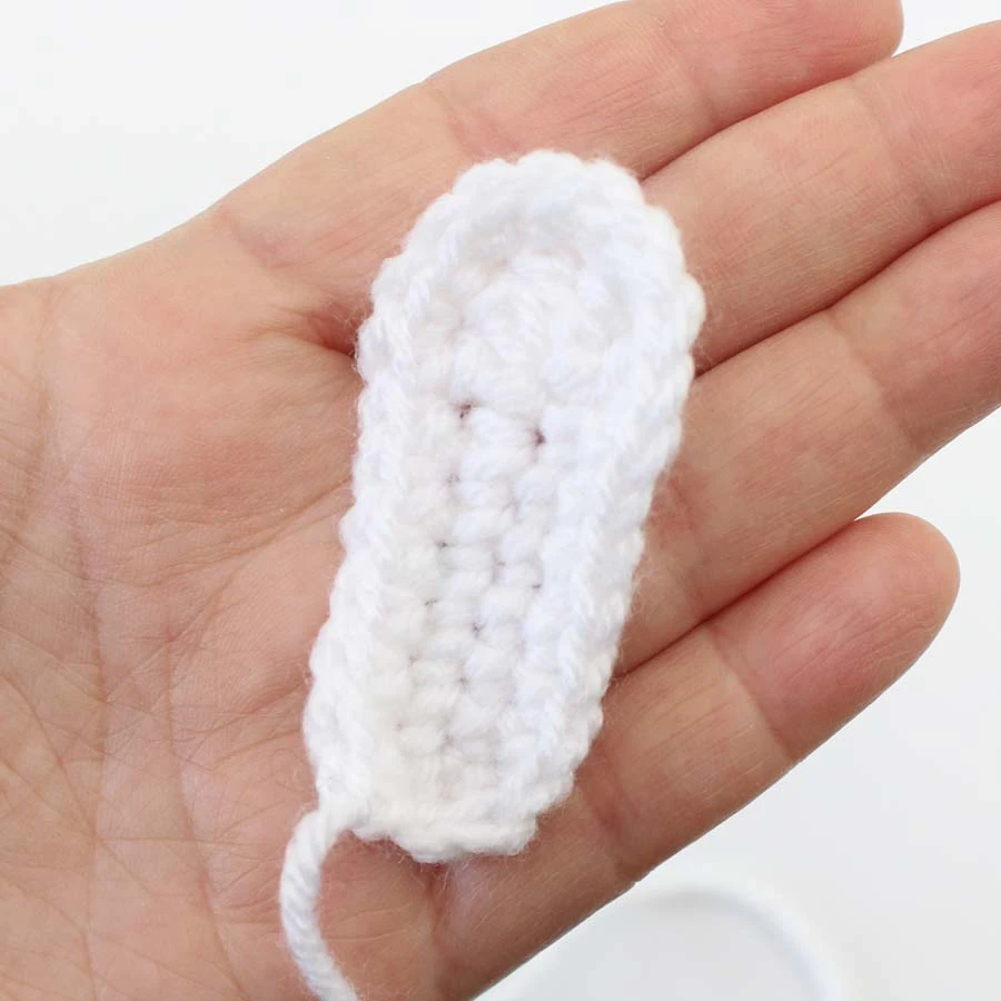 Round 1: In white, ch 9, SC in 2nd ch from hook, SC in next 6 sts, 5 DC in last st. Continue around so you are working on the other side of the chain. SC next 7 sts (last SC will be at the starting end of the chain in the same stitch as your first SC). (19)