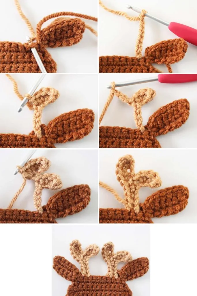 Right antler: With light brown yarn, make a slipknot. Insert crochet hook into the first stitch next to the stitch you joined to when fastening off. Pull through the slipknot, chain 8, starting in 2nd ch from hook, 2 HDC in first 2 chs, sl st in next ch. Chain 4, starting in 2nd ch from hook, 2 HDC in first 3 sts, then SC in last 4 chs back down towards head, sl st join in the next st to the left of where you started the antler. Fasten off, cut yarn, weave in ends.