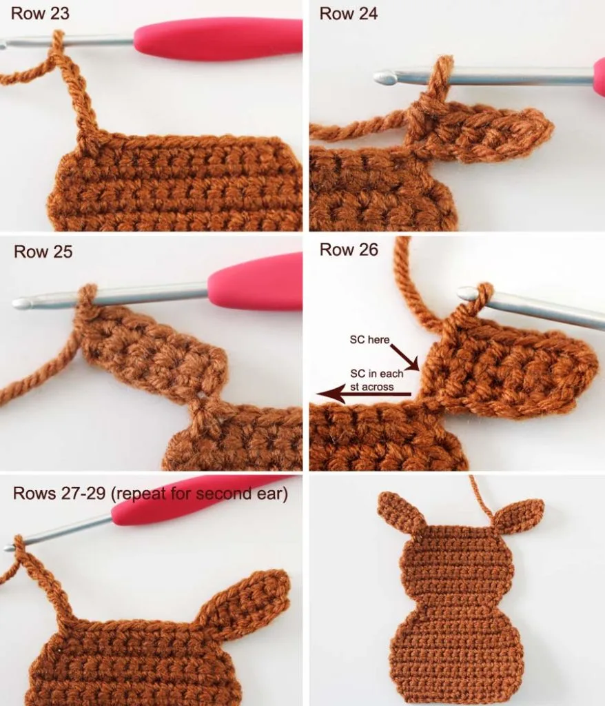 Row 29: SC in each of the 5 sts along the top of the ear, then add one SC in the next st below (at the end of the previous row), sl st in next st to join to head, fasten off (6)
