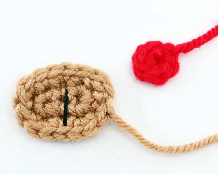 Round 1: In light brown yarn, ch 4, 2 SC in 2nd ch from hook, SC next st, 4 SC in last st. Continue around so you are working on the other side of the chain. SC in next st, 2 SC in last st (this is the same stitch as where you placed the 2 SC at the start of the round), join, ch 1 (10)