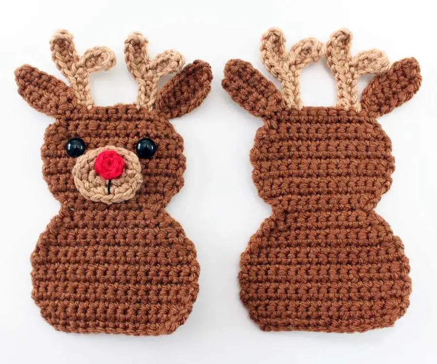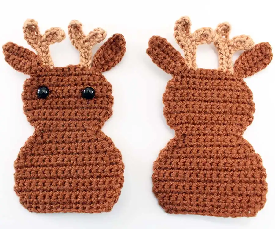 Make two SC stitches in each of the two stitches at the tip of each ear and at the tip of each antler bump to prevent the stitches from curling. Make two SC stitches in the bottom left corner stitch. When you get back to the right corner stitch you started in, make another SC, and then join with the sl st to the top of the first SC. Cut yarn and weave in ends.