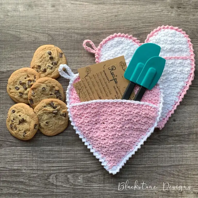 This heart shaped potholder is perfect for adding to your kitchen decor! Or you can gift it with some kitchen supplies in the pocket too! I love the idea of these hanging on a hook in the kitchen. They are so cute!