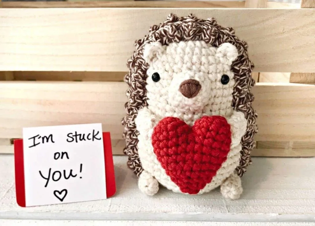 An adorable little hedgehog is sure to brighten up anyone’s day! I love its tiny features and the textured stitches for the quills! Combining this little cutie with a sweet note makes the perfect Valentine’s Day gift.