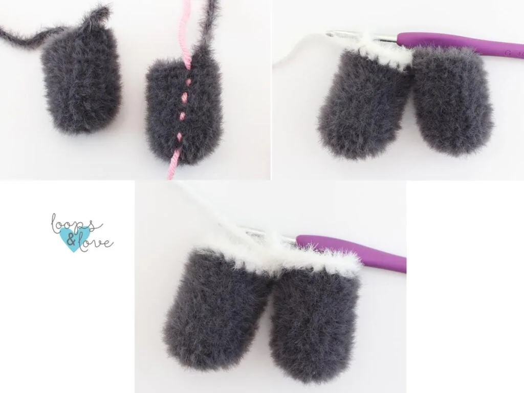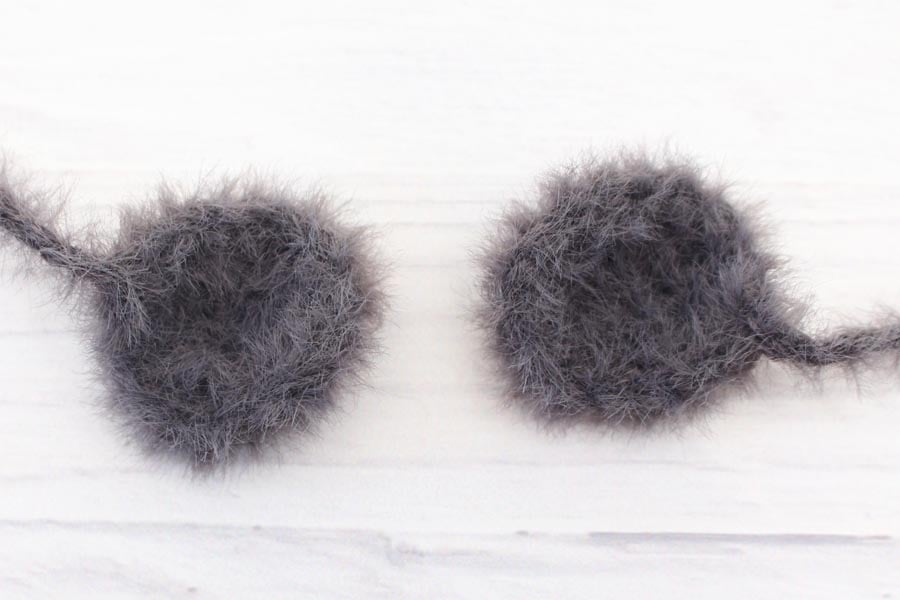 Round 1: In grey, ch 3, 2 SC in 2nd ch from hook, 4 SC in last ch. Continue around so you are working on the other side of the chain. 2 SC in next st (this is the last stitch and will be the other side of the same stitch as the first 2 SC of the round). Sl st join to first st, ch 1. (8)