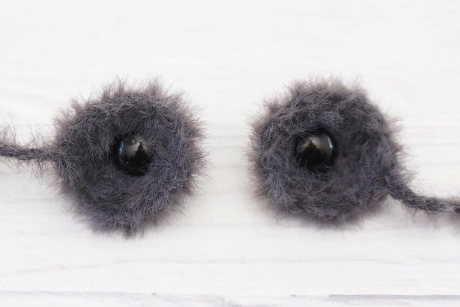 Place a safety eye in each eye patch in the last stitch of the starting chain (so the eyes are closer to one side of the patch and not in the center). Do not secure the backs of the safety eyes yet.