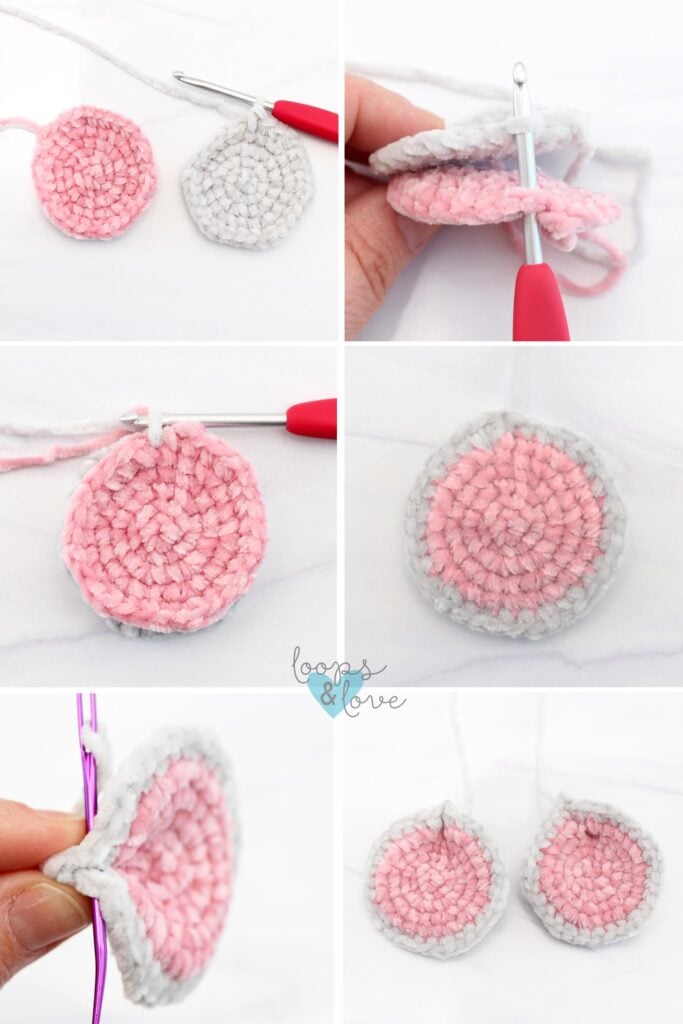 Fasten off. You can weave in the yarn tail now, or crochet over it in the next step to secure it. This circle will be the inner ear part.