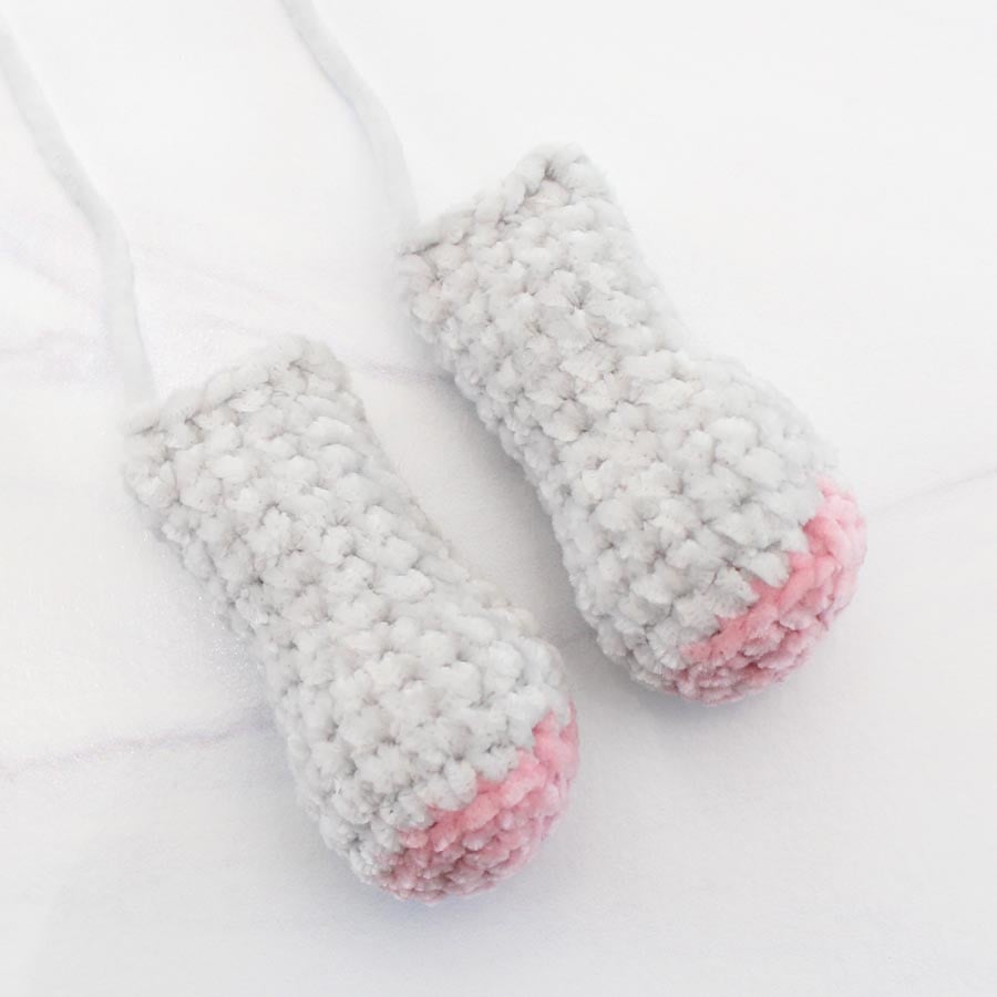 Pinch leg flat and SC across the top (through both layers) to close. Fasten off, leaving a long tail. Repeat instructions above for second leg. Set legs aside for sewing later.