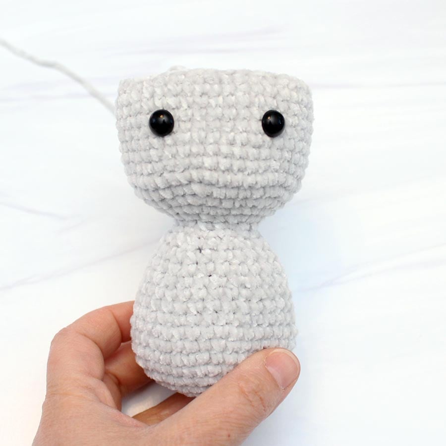 Insert safety eyes between rounds 28 and 29, about 7 stitches apart in the center of the face. Sew on the trunk onto the center of the face. The top of the trunk lines up with the bottom of the eyes.